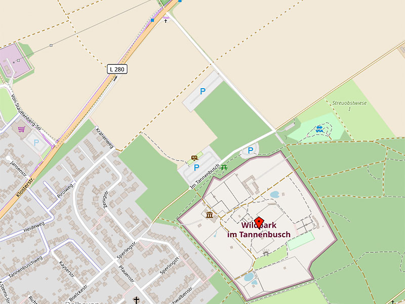 Der Wildpark Tannenbusch liegt an der Provinzialstraße zwischen Dormagen-Horrem und Dormagen-Delhoven. Wenn Sie die Autobahn A57 an der Anschlussstelle Dormagen Richtung Delhoven verlassen, folgen Sie kurz vor Delhoven dem Wegweiser Geopark. Dabei verlassen Sie die Provinzialstrasse und befinden sich bereits auf dem Weg zum Tannenbusch/Geopark.